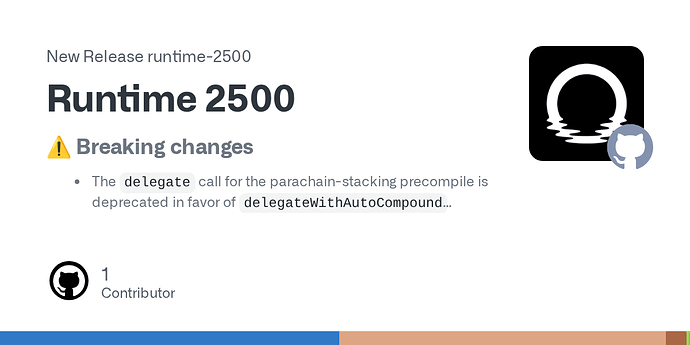 The delegate call for the parachain-stacking precompile is deprecated in favor of delegateWithAutoCompound (#2333 )