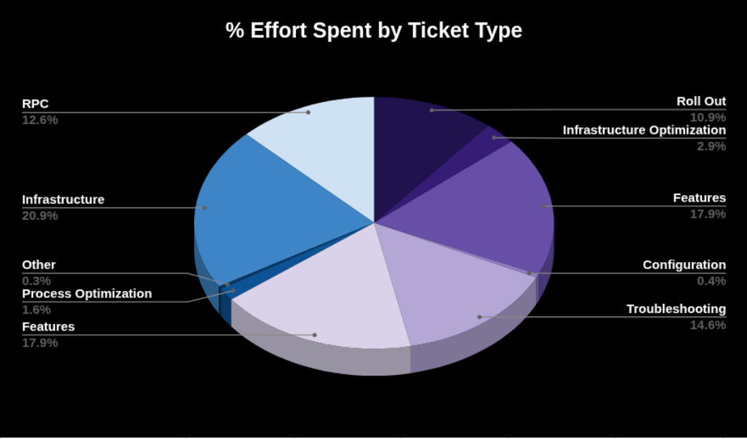 To demonstrate realized value, we attach Appendix A summarizing the last semester’s work: 45 tickets delivered with effort distribution by category (Features, Incidents, Updates, Support and etc). This evidences where treasury funds translated into operational continuity and feature delivery, and it informs our focus for the coming term